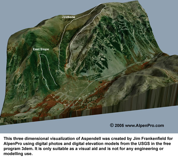 This is an enhanced section of a USGS 7.5' quad for the area including Aspendell. Maps can be found online as .drg files. These can be combined as an overlay with digital USGS .dem files (Digital Elevation Models). Various shadings can be applied.