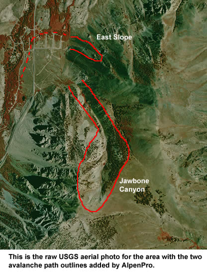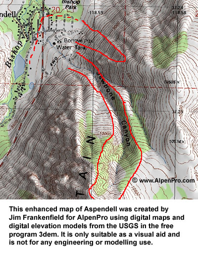 The USGS also makes available digital aerial photography. This is from the .doqq file covering Aspendell and is unenhanced except for the avalanche path outlines.