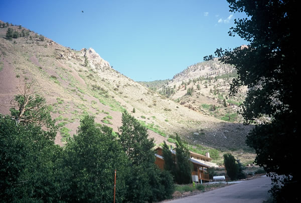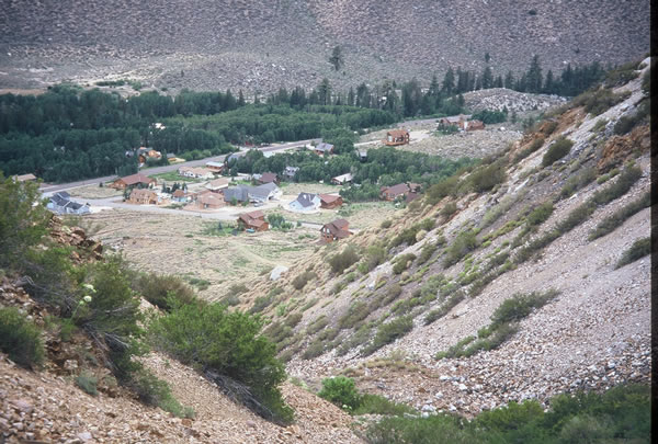 This is the view looking out the bottom of Jawbone Canyon. While there is a ridge on the right side which offers some protection to that end of Tract 2 it does not prevent all damage. Dry snow avalanches can jump such barriers, and did so in 1986 and 1969. |