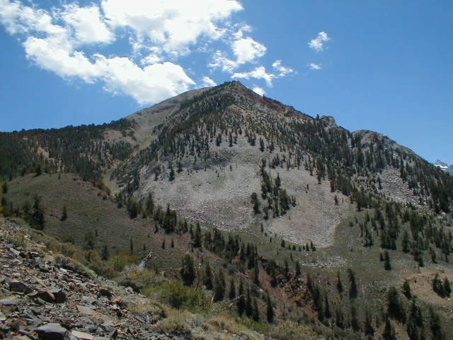 This shows the starting zone and upper avalanche path in Jawbone Canyon, on Table Mountain. This was taken from near the top of the East Slope during a field survey to obtain the slope profile directly. |