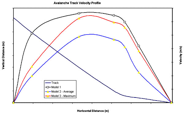 For this graph two different models were used. The highest line (Model 1) came from the same one used above. The other two lines are from a second model which is different and which calculates both an estimated average snow velocity and an estimated maximum velocity within the moving snow. |