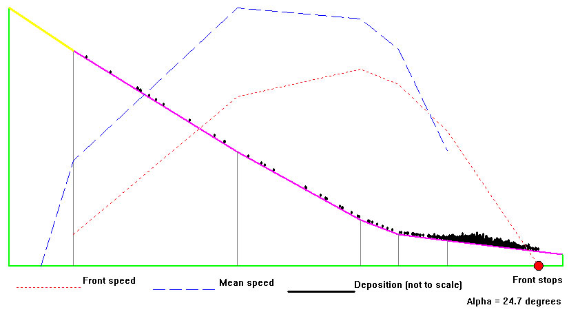 This is a model output which shows the estimated mean speed of the snow and the estimated speed of the front (for the initial impact). It also gives an idea of the final deposition. (The weight of this on any structure can be a significant design parameter.) You can also see the segments which the path was broken down into, with the starting zone shown in yellow. |
