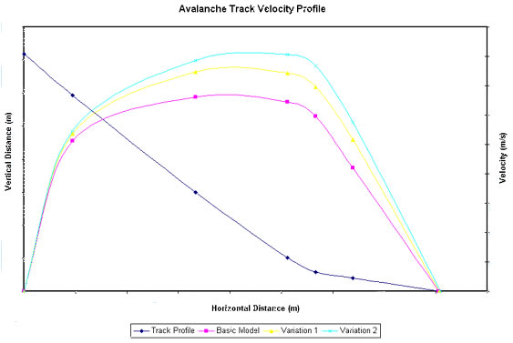 This graph results from physically modeling the flow of snow down the fall line. For this graph one particular model was used, along with two variations of the basic version. The variations are related to the way in which the estimated friction parameters are handled. |