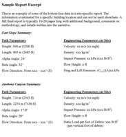 This excerpt shows tables with basic numerical parameters and estimates. Note that for the East Slope there is a potential for an airblast (or "powder avalanche") and therefore anticipated aerodynamic drag and lift pressures have been included in the engineering report. A full report is typically 10-20 pages long with additional information.